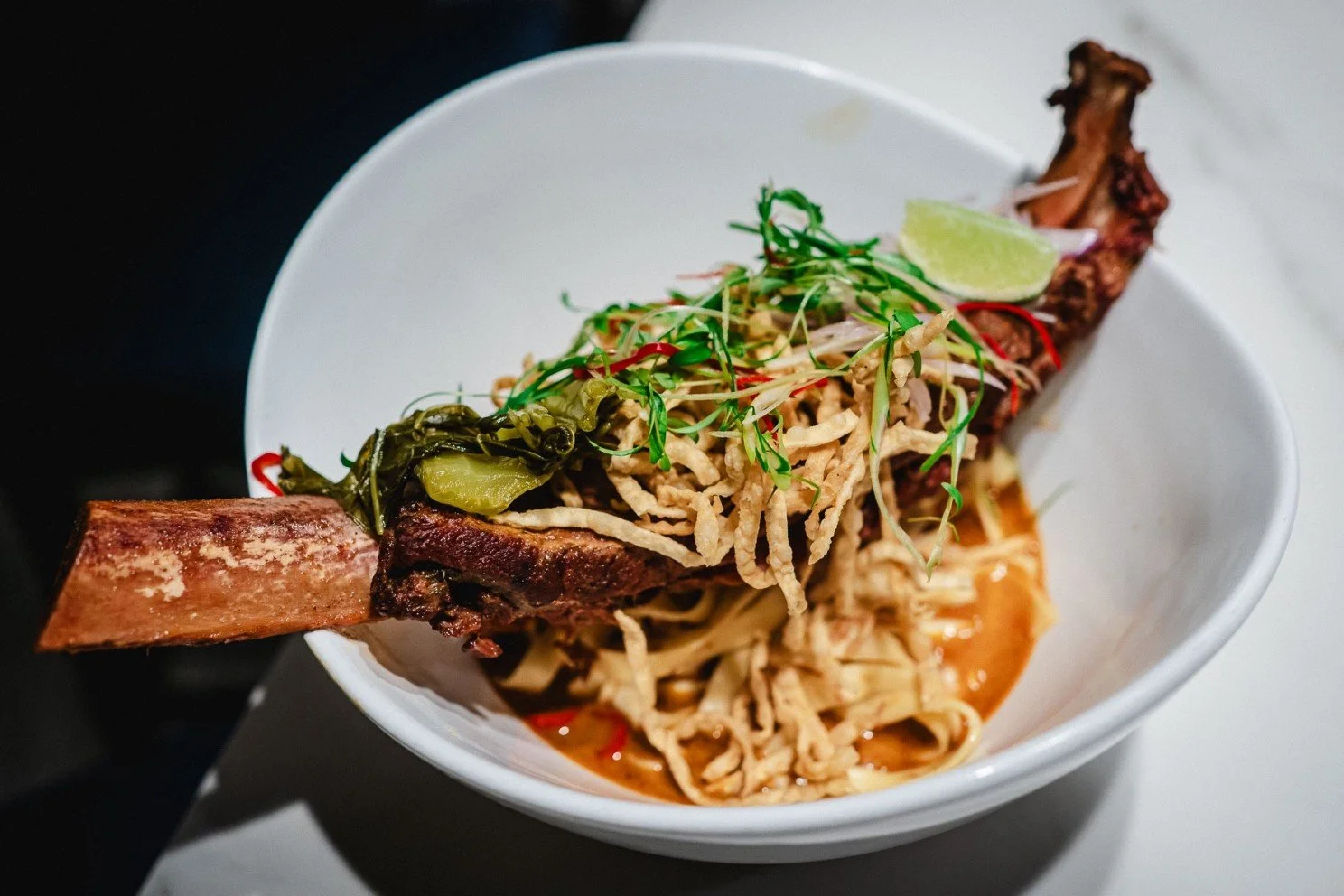 It was within that context that Nick Liu of DaiLo served a slow-smoked dinosaur rib (beef) with curried hand-cut noodles, pickled mustard greens, and a fried egg-noodle garnish.